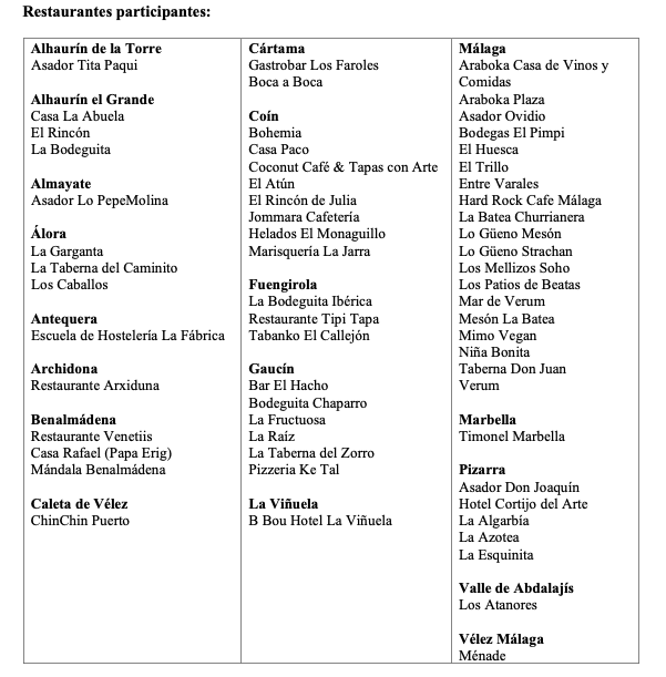 Este año la Ruta Gastronómica Tomate Huevo Toro se celebra en 18 municipios de la provincia: Alhaurín de la Torre, Alhaurín el Grande, Almayate, Álora, Antequera, Archidona, Benalmádena, Caleta de Vélez, Cártama, Coín, Fuengirola, Gaucín, La Viñuela, Málaga, Marbella, Pizarra, Valle de Abdalajís y Vélez Málaga y es una actividad que cuenta con el apoyo de Diputación de Málaga y Junta de Andalucía.